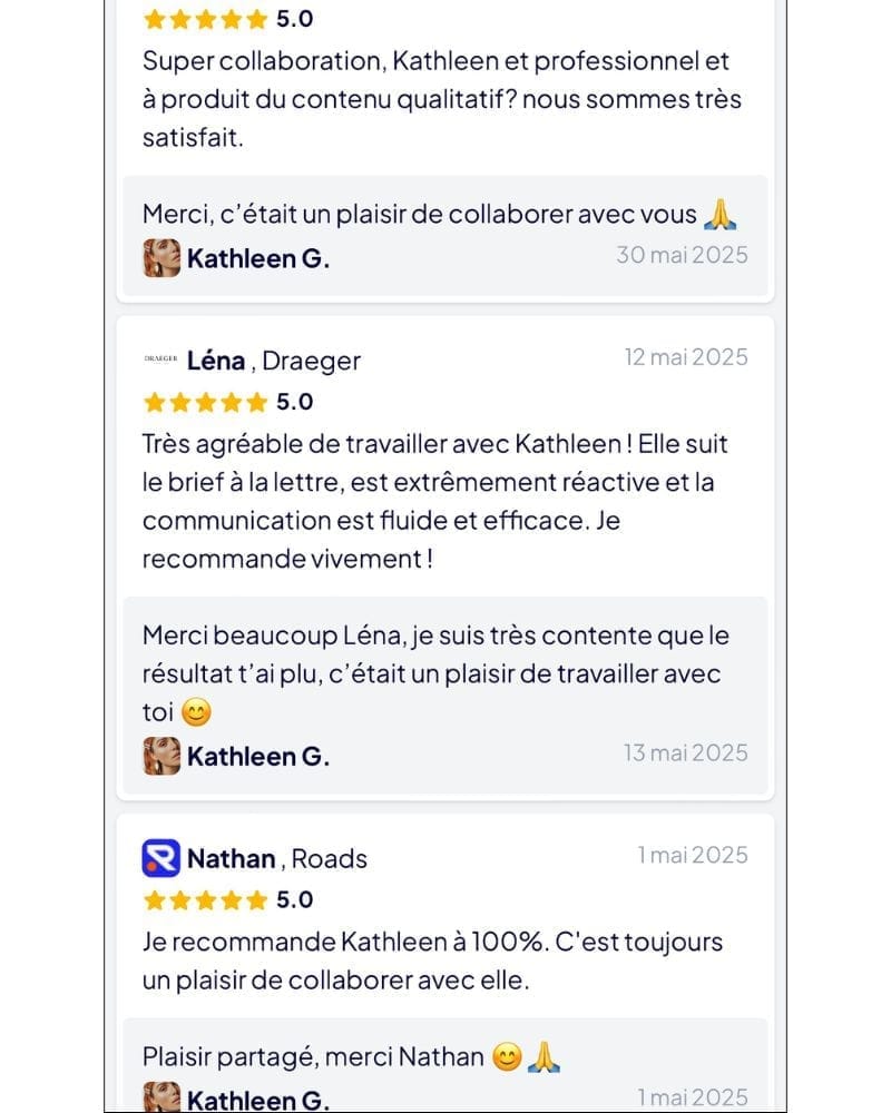 ✅ Tu découvriras comment livrer un contenu réellement impactant qui te permettra de te démarquer des autres UGC et qui donne envie aux marques de travailler à nouveau avec toi. Et donc à fidéliser tes clients et stabiliser tes revenus sur le long terme.