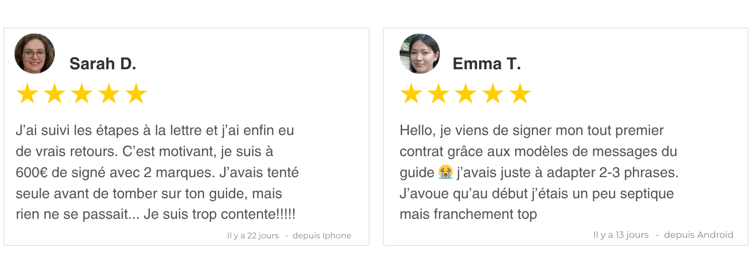 🎁 BONUS 1 : dans le guide tu accèdes à la liste de 100 e-mails (contacts directs des marques) qui travaillent avec des UGC, que tu pourras démarcher, comme je te l'aurai appris dans le guide !