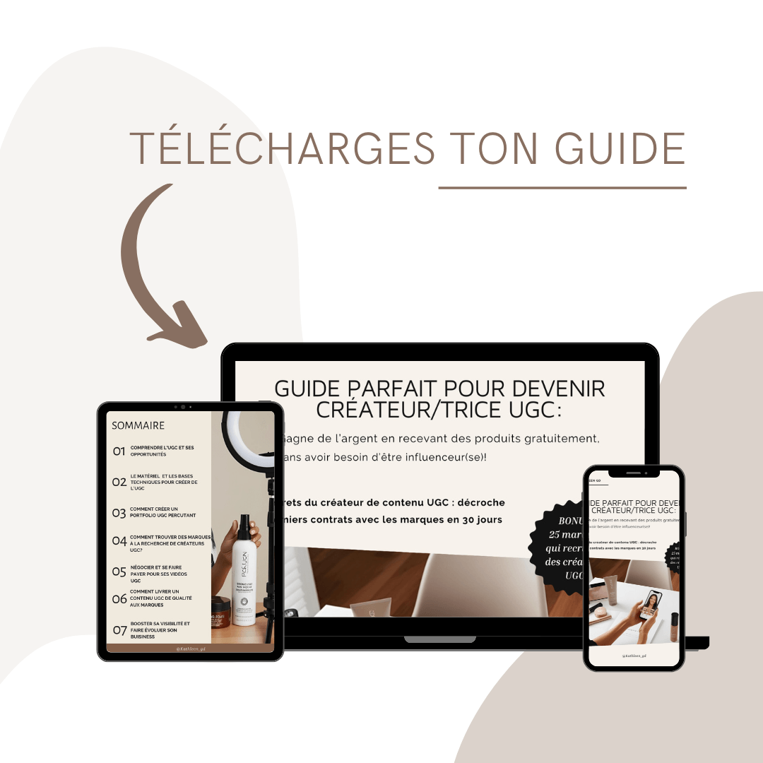 ✨ Tu n'as pas besoin de publier le contenu sur ton profil personnel, il suffit d’envoyer le contenu aux marques pour qu’elles l’utilisent. Tout est expliqué dans le guide.